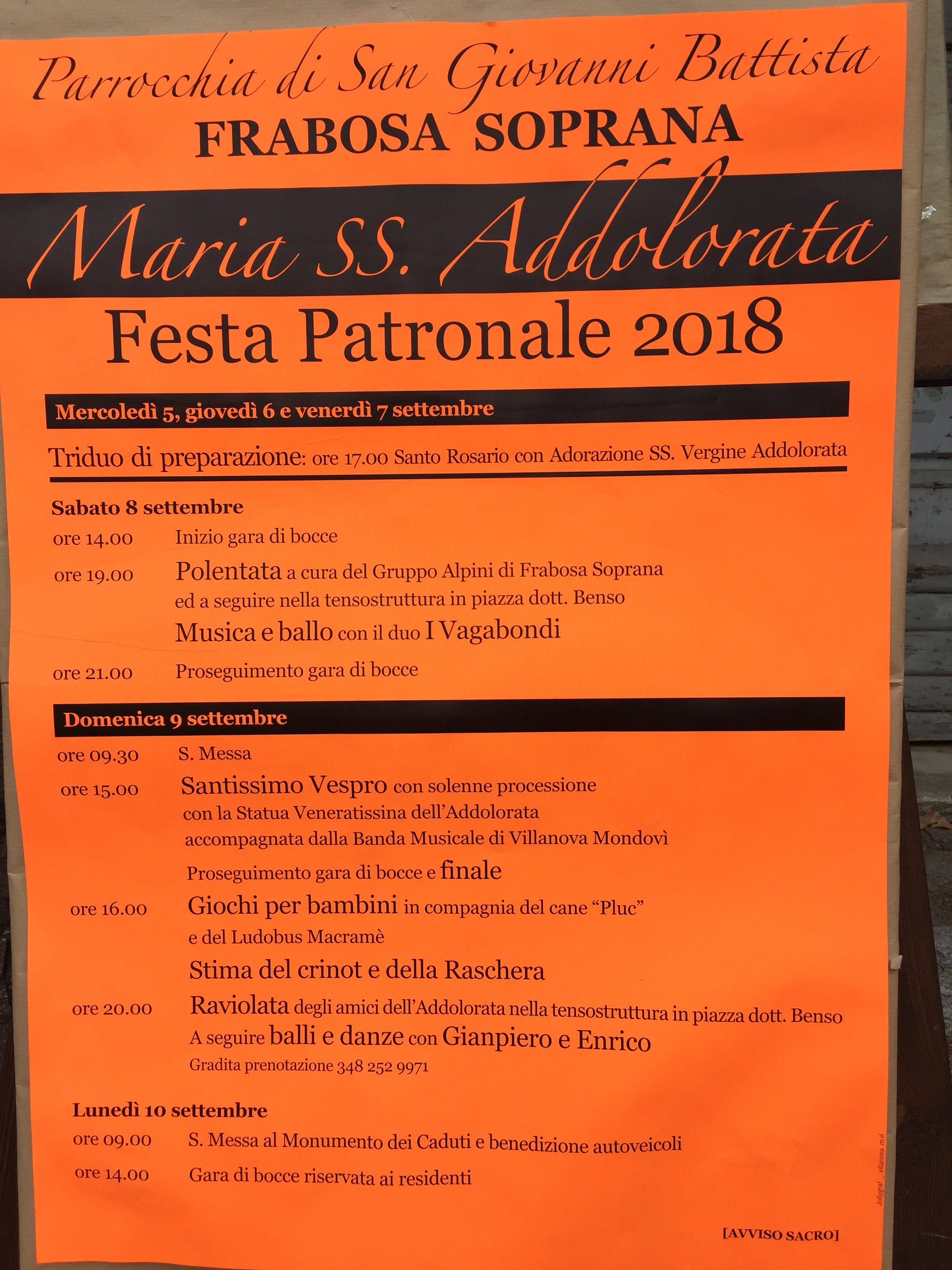 Ecco di seguito la locandina dei festeggiamenti patronali che si terranno a Frabosa Soprana il prossimo weekend (8-9 settembre 2018).