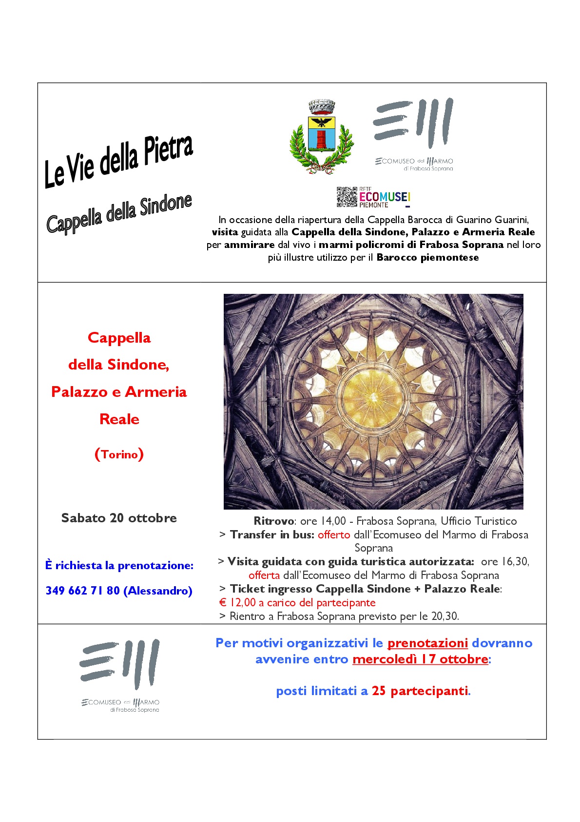 In occasione della riapertura della Cappella Barocca di Guarino Guarini vi aspettiamo sabato 20 ottobre per la visita guidata alla Cappella della Sindone, Palazzo e Armeria Reale per ammirare del vivo i marmi policromi di Frabosa Soprana nel loro più illustre utilizzo per il Barocco piemontese.